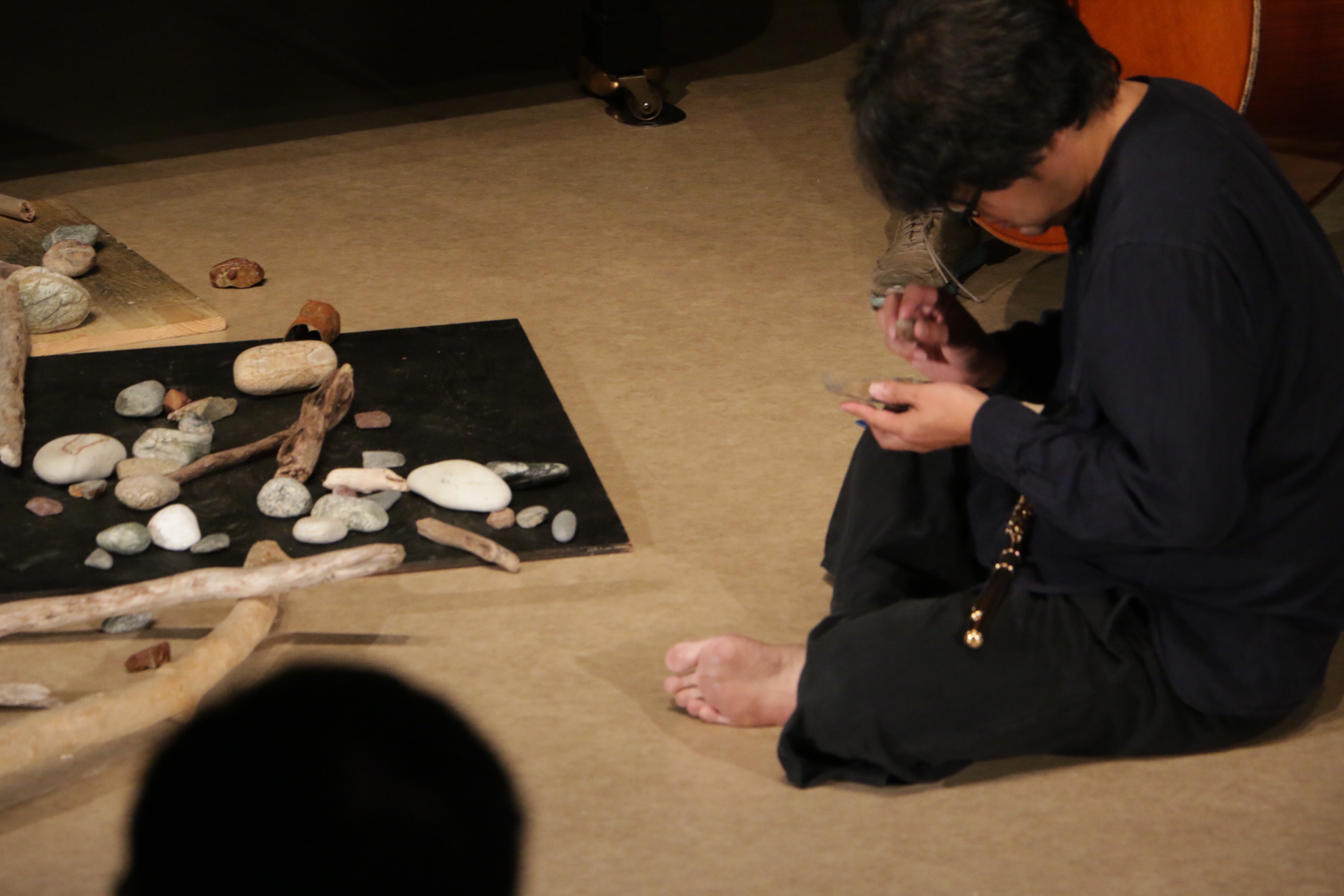 普段我々が練習している楽器を手放し、そこらへんにある石を拾ってきて、それを打ち付けたり、擦ったり、積み上げたりのセッションを行いました。