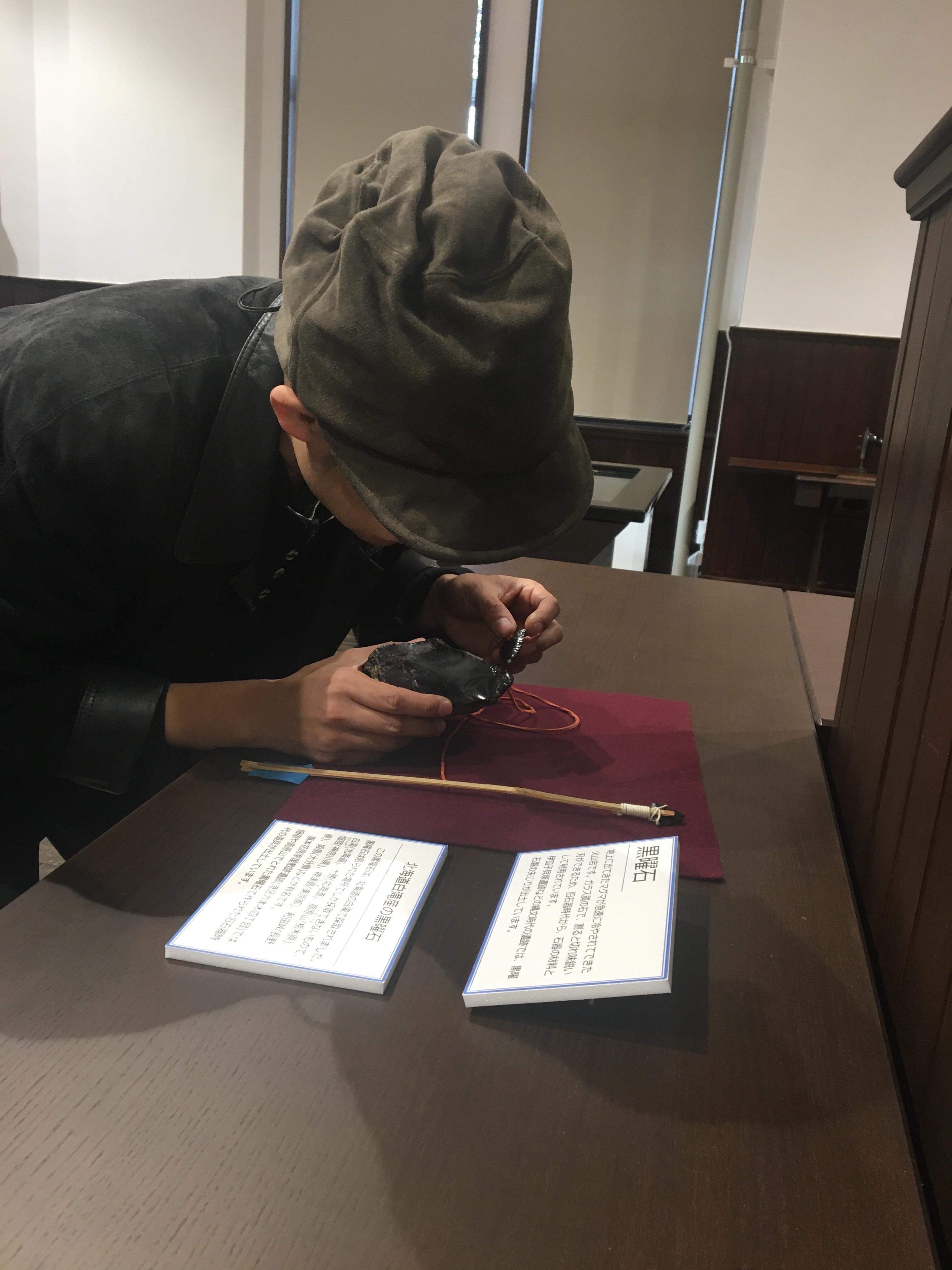 アイヌの黒曜石の展示もあり、最近常に首からぶら下げている黒曜石の矢じりを擦り付け「お友達ですよ~」と話しかける落合監督。トリップしてます。