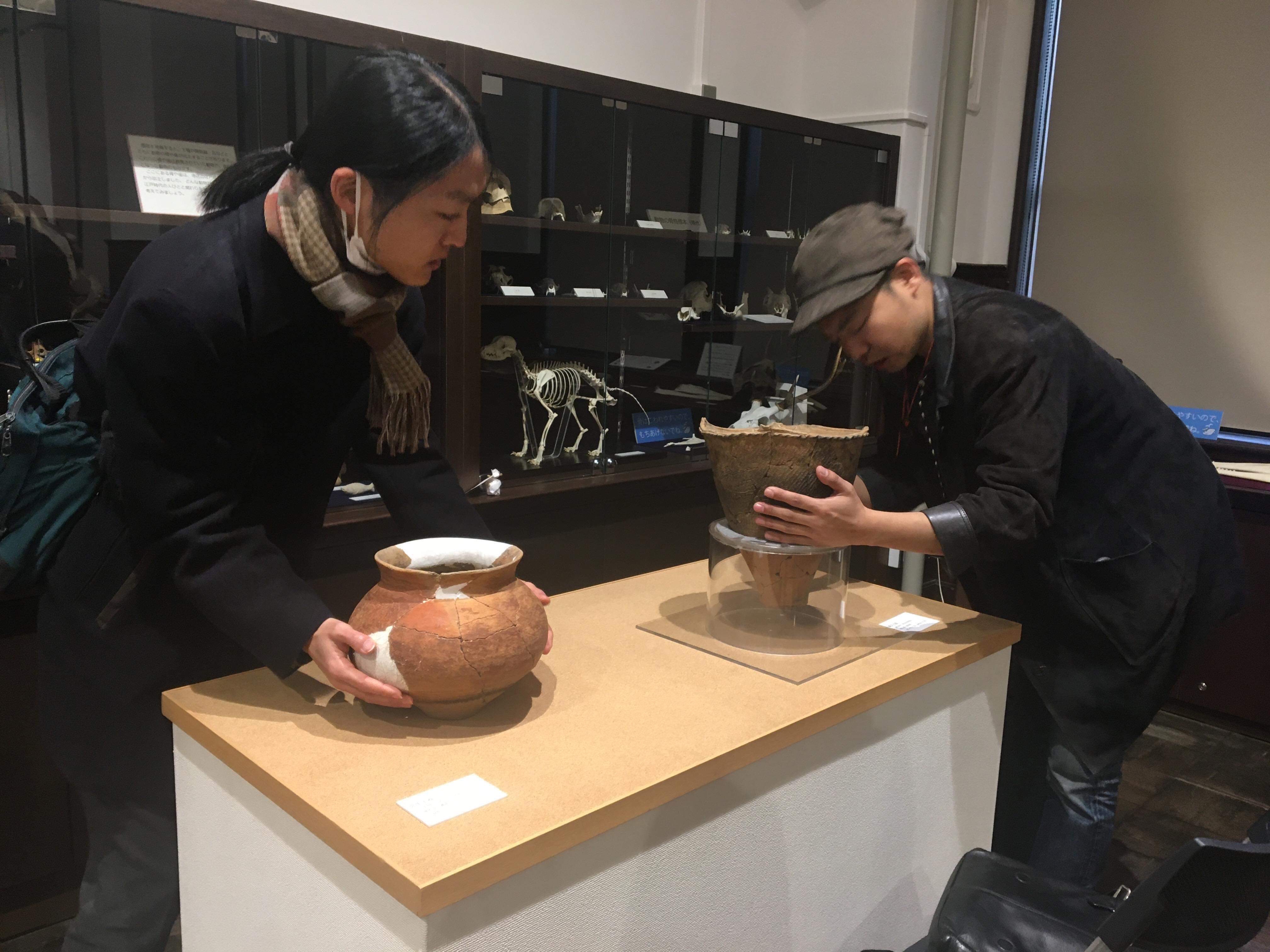 そして本日のメインの一つである郷土歴史館。ここには縄文土器と弥生土器が展示されています。しかもなんと、触ることができます。