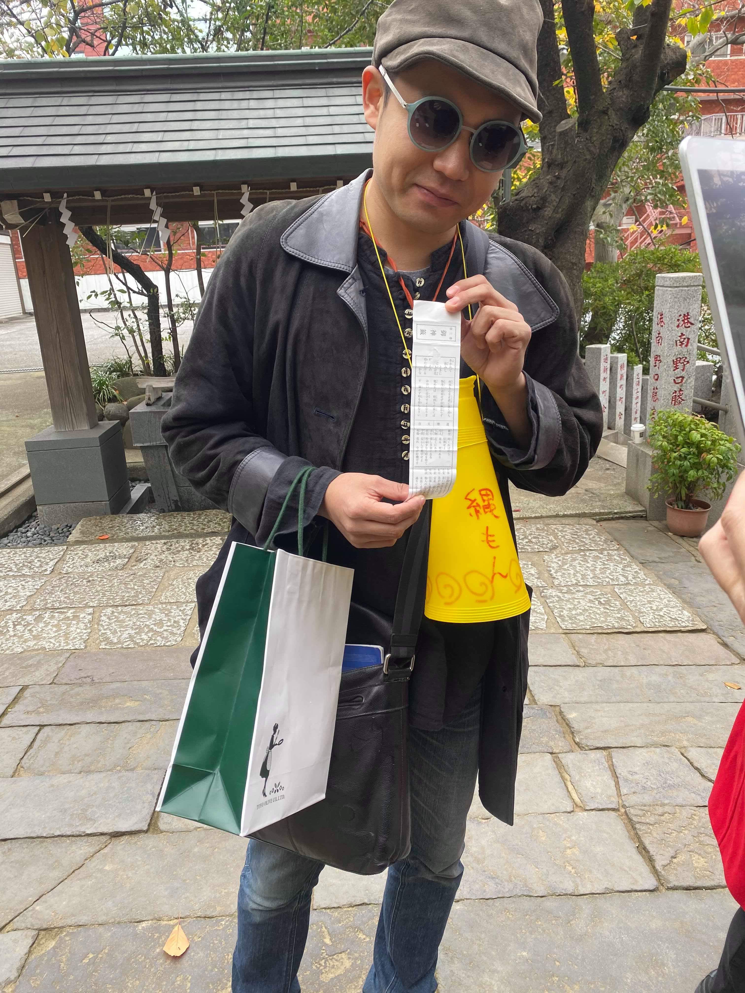 公園の裏には円墳を守るように御田八幡神社があります。おみくじで大吉を引きご満悦の落合監督。