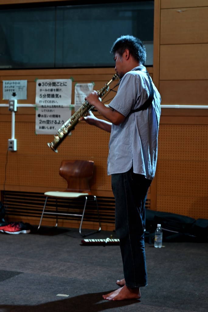 ピアノ中村・サックス津山・ギターえびら・ダンス飯塚の運営メンバーに加え、ダンスYさん、はじめましてのソプラノサックスHさんが参加しました。
