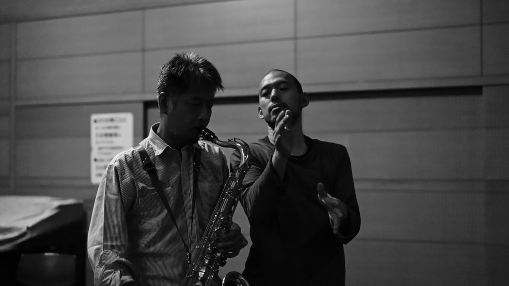 音楽家が「邪魔をする」バージョンもやってみました。これは難しかった。特に、邪魔する方がずっと音を出してしまうと良くなかった。邪魔をさせるために、ピアノが綺麗な音をだして、サックスが汚い音を出すというようなパターンになってしまいました。逆にちょこちょこ聞こえるかどうかの小さい音でやった方が耳障りでよかったかも。